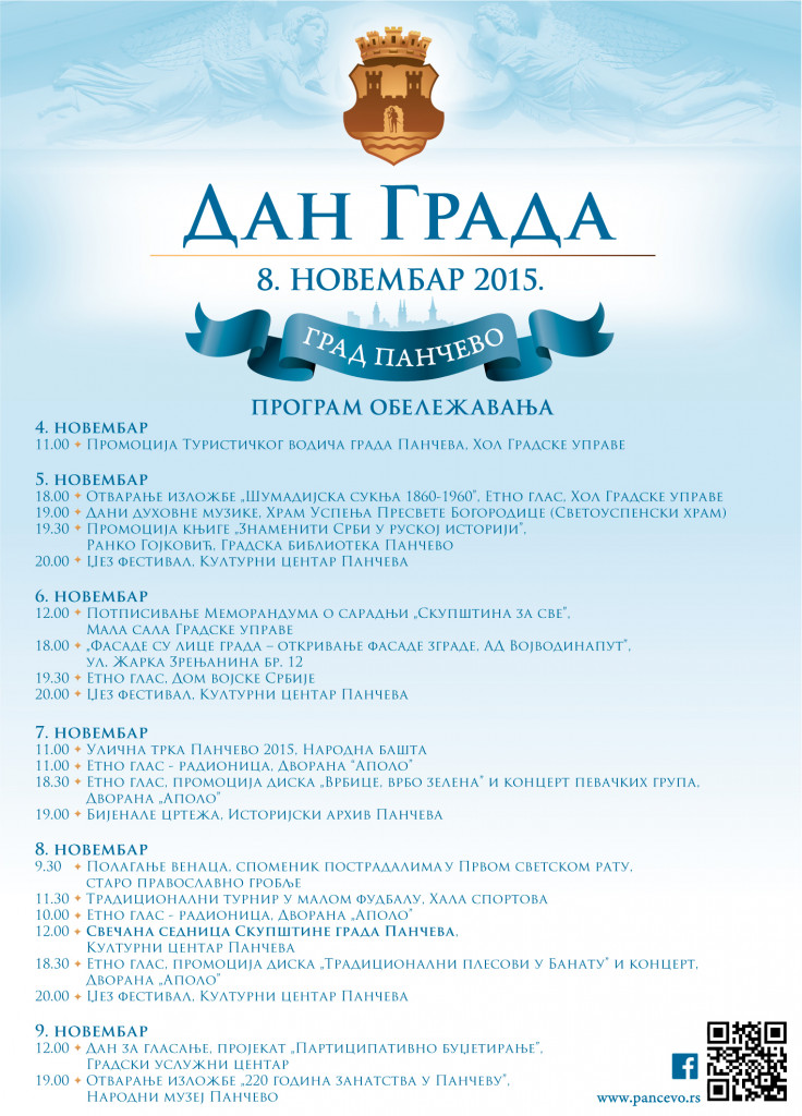 Дан града Панчева – 8. новембар Честитамо Дан града Панчева, 8. новембар! Позивамо све грађанке и грађане да заједно обележимо овај дан. Погледајте и испратите програм од 4. до 9. новембра 2015. године. Програм Дан града 2015. Leonida Radanov2018-01-28T21:25:32+01:0030/10/2015| Одаберите платформу и поделите! FacebookXRedditLinkedInEmail