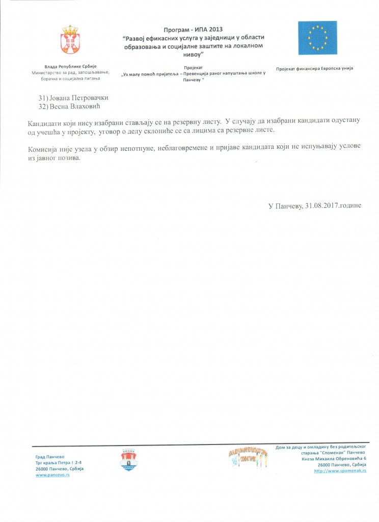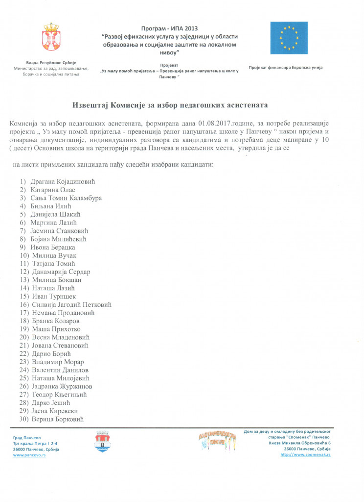 Комисија за избор педагошких асистената, формирана дана 01.08.2017. године, за потребе реализације пројекта „Уз малу помоћ пријатеља – превенција раног напуштања школе у Панчеву“ након пријема и отварања документације, индивидуалних разговора са кандидатима и потребама деце мапиране у 10 (десет) Основних школа на територији града Панчева и насељених места, утврдила је да се на листи примљених кандидата нађу следећи изабрани кандидати (погледати приложене слике).