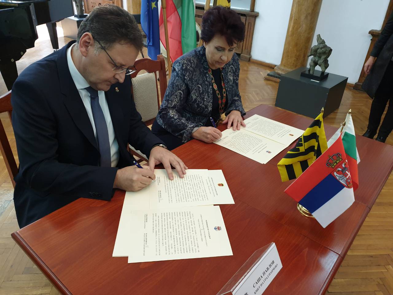 Градоначелник Панчева Саша Павлов и градоначелница Перника (Република Бугарска) Вјара Церовна потписали су данас, 19. октобра 2018. године у Пернику Меморандум о сарадњи између два града.